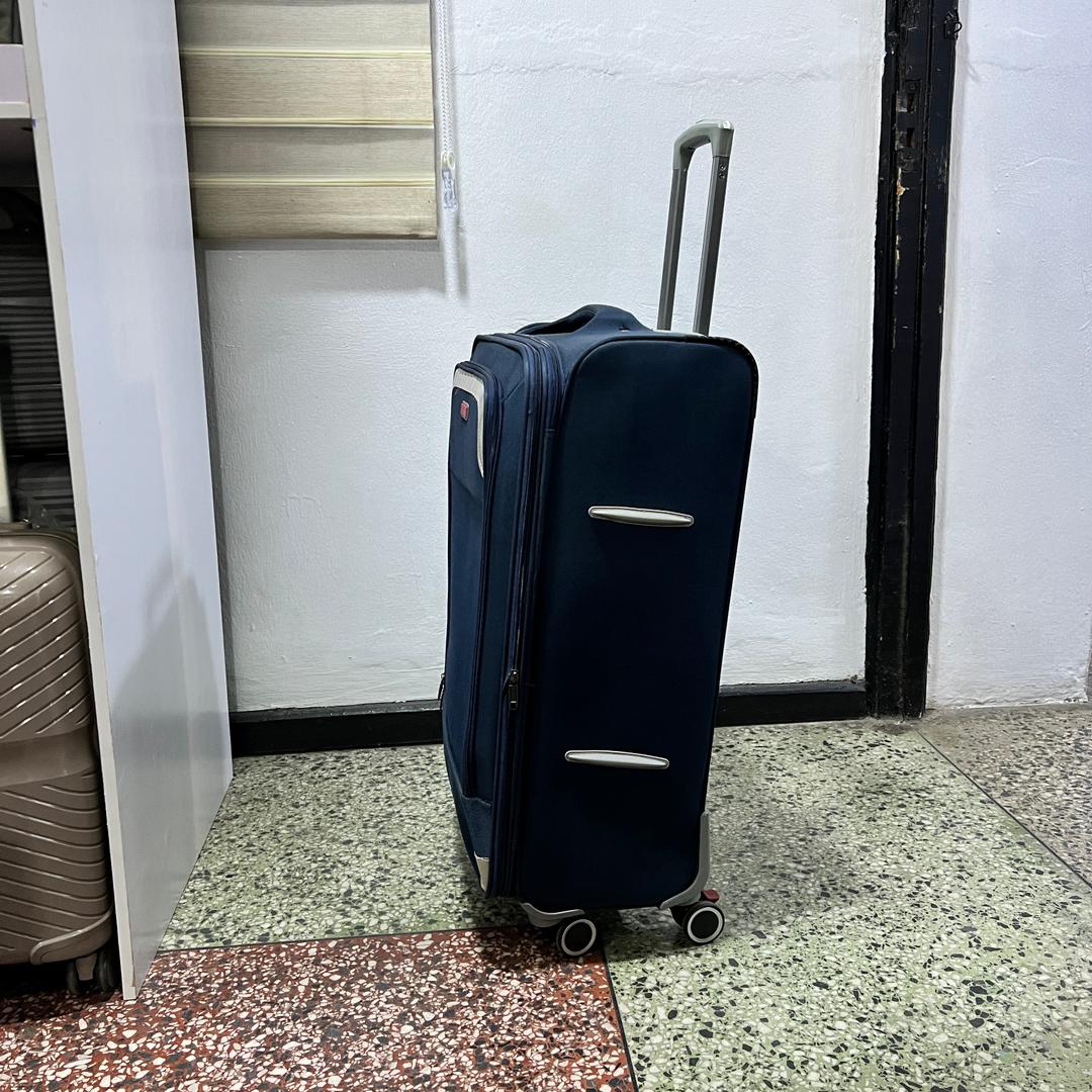 - Sleek navy blue exterior with refined silver corner accents and a bold red brand insignia for a distinguished look.