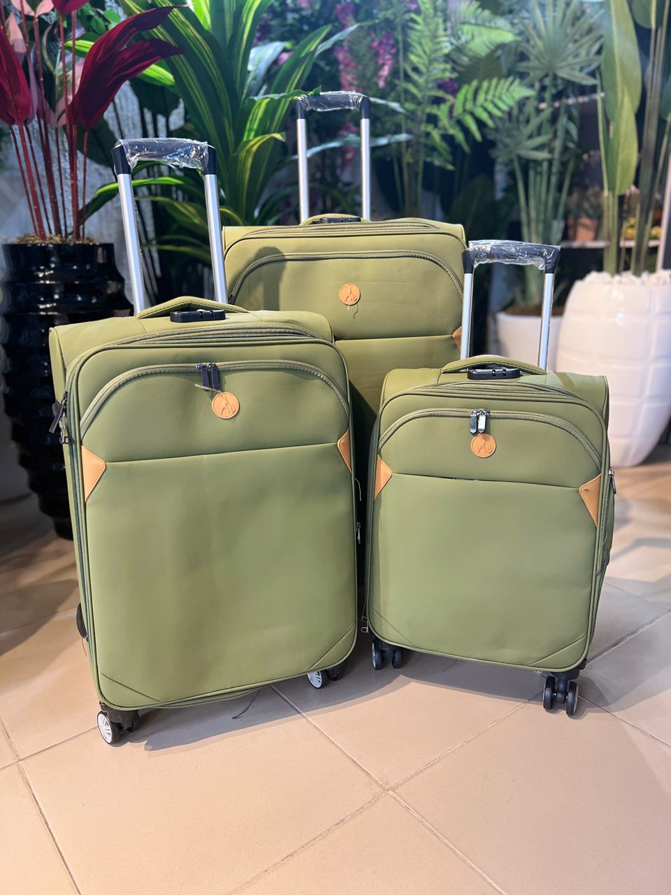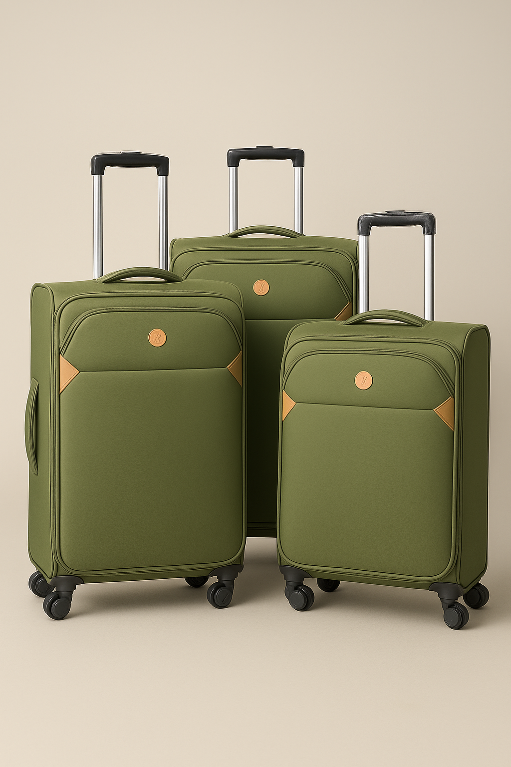 3-in-1 Olive Green Soft Luggage Set – Travel in style and comfort with this premium olive-green luggage collection. Designed for durability and elegance, each suitcase is crafted from high-quality, wear-resistant fabric with a smooth finish and refined tan corner accents that add a touch of sophistication.