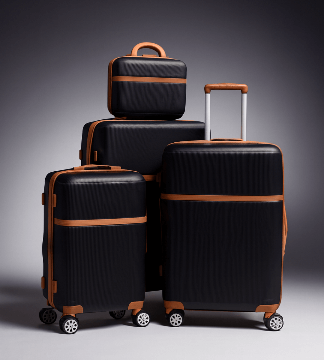 Black Luxe 4-in-1 Luggage Set – Designed for the modern traveler, this sleek black and tan suitcase collection combines luxury and function. Crafted from durable, lightweight polycarbonate, it features smooth 360° spinner wheels, sturdy handles, and spacious interiors for effortless organization. Perfect for business or leisure travel in timeless style.