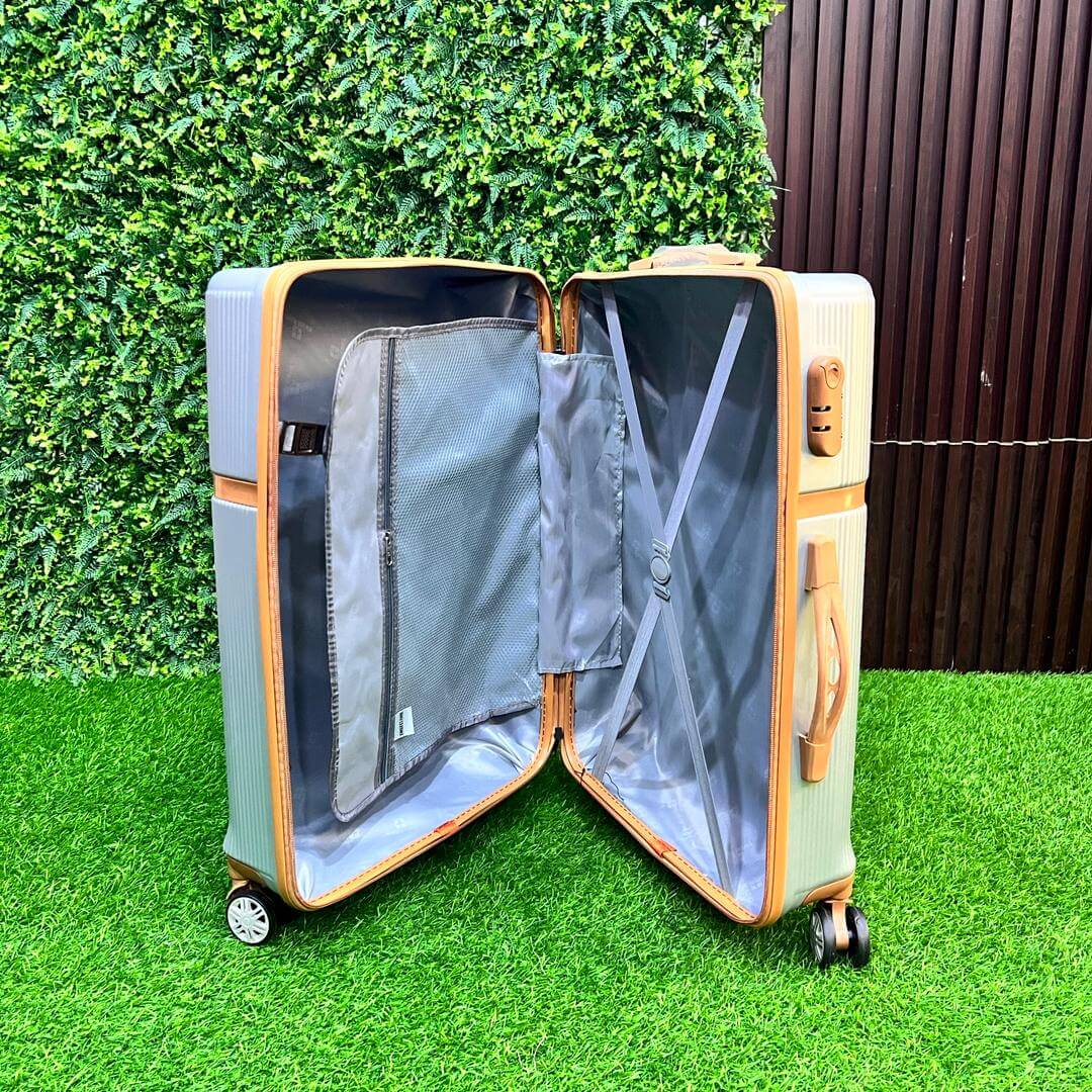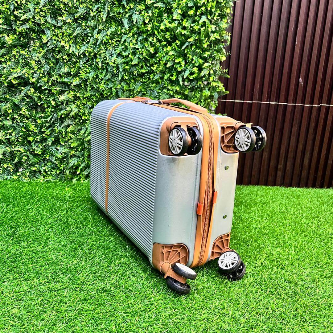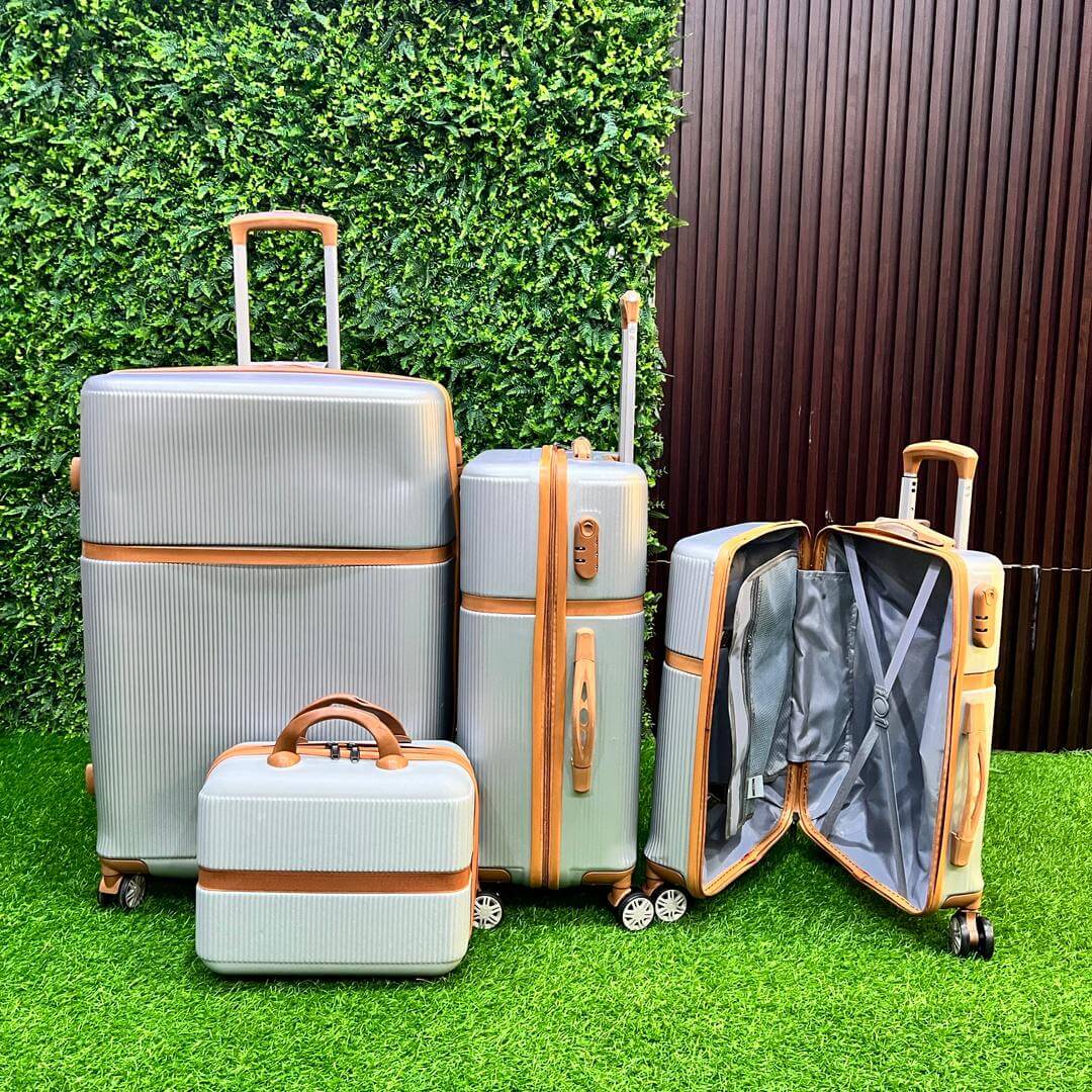 Green Luxe 4-in-1 Luggage Set – Travel in style with this elegant silver and tan suitcase collection. Made from durable, lightweight polycarbonate, each piece features 360° spinner wheels, smooth telescopic handles, and a spacious, organized interior. Perfect for both short trips and long journeys.Spinner Wheel LuggageSpinner Wheel Luggage