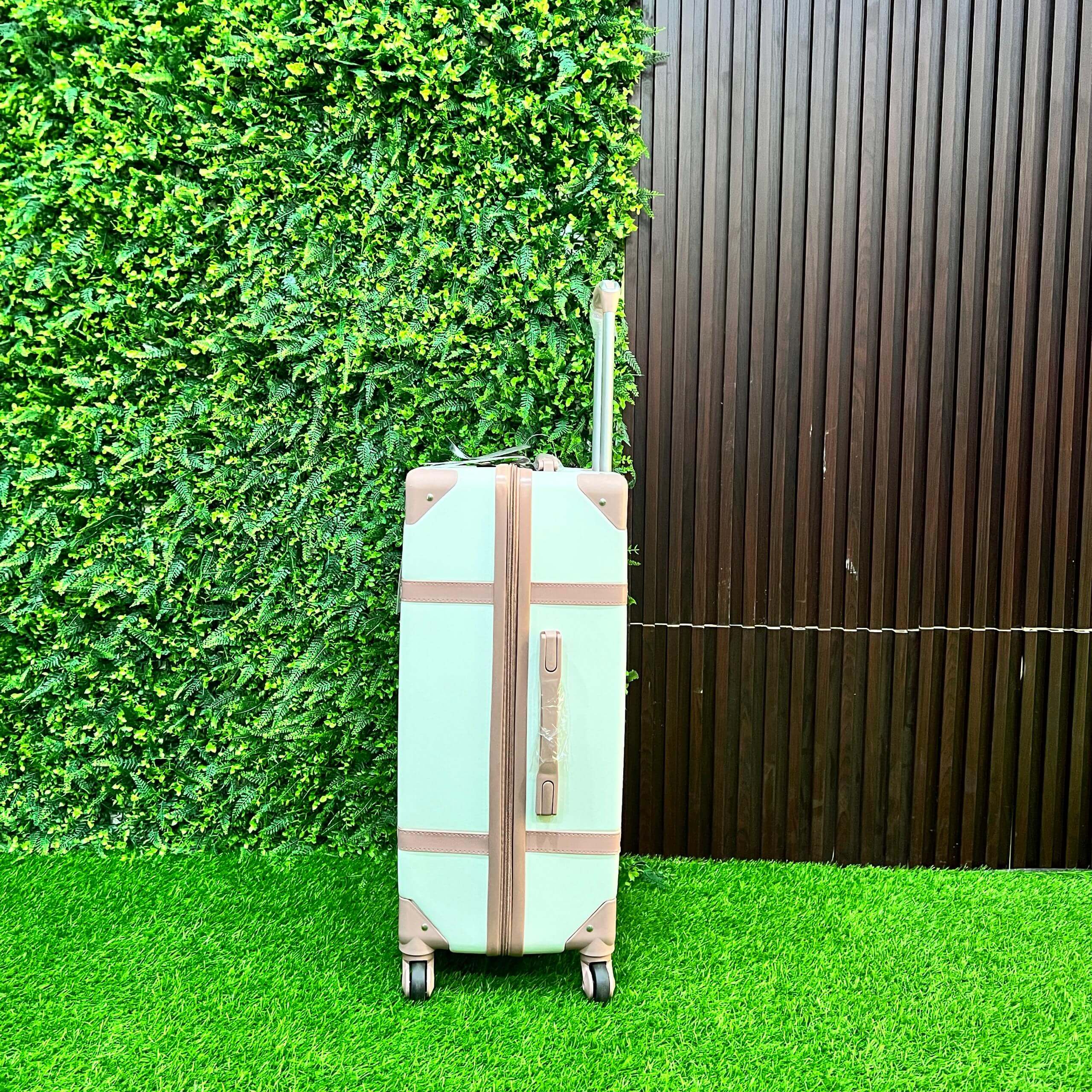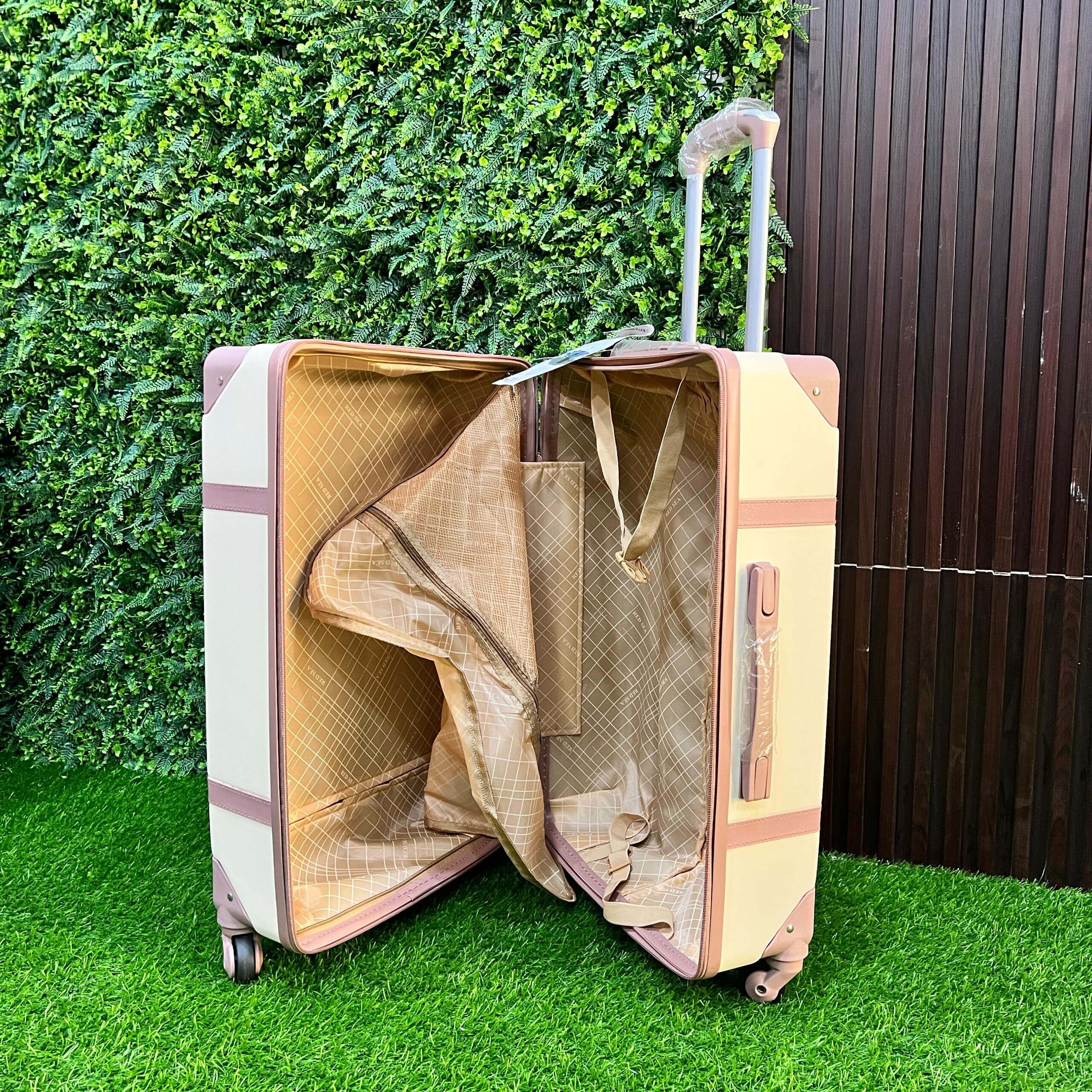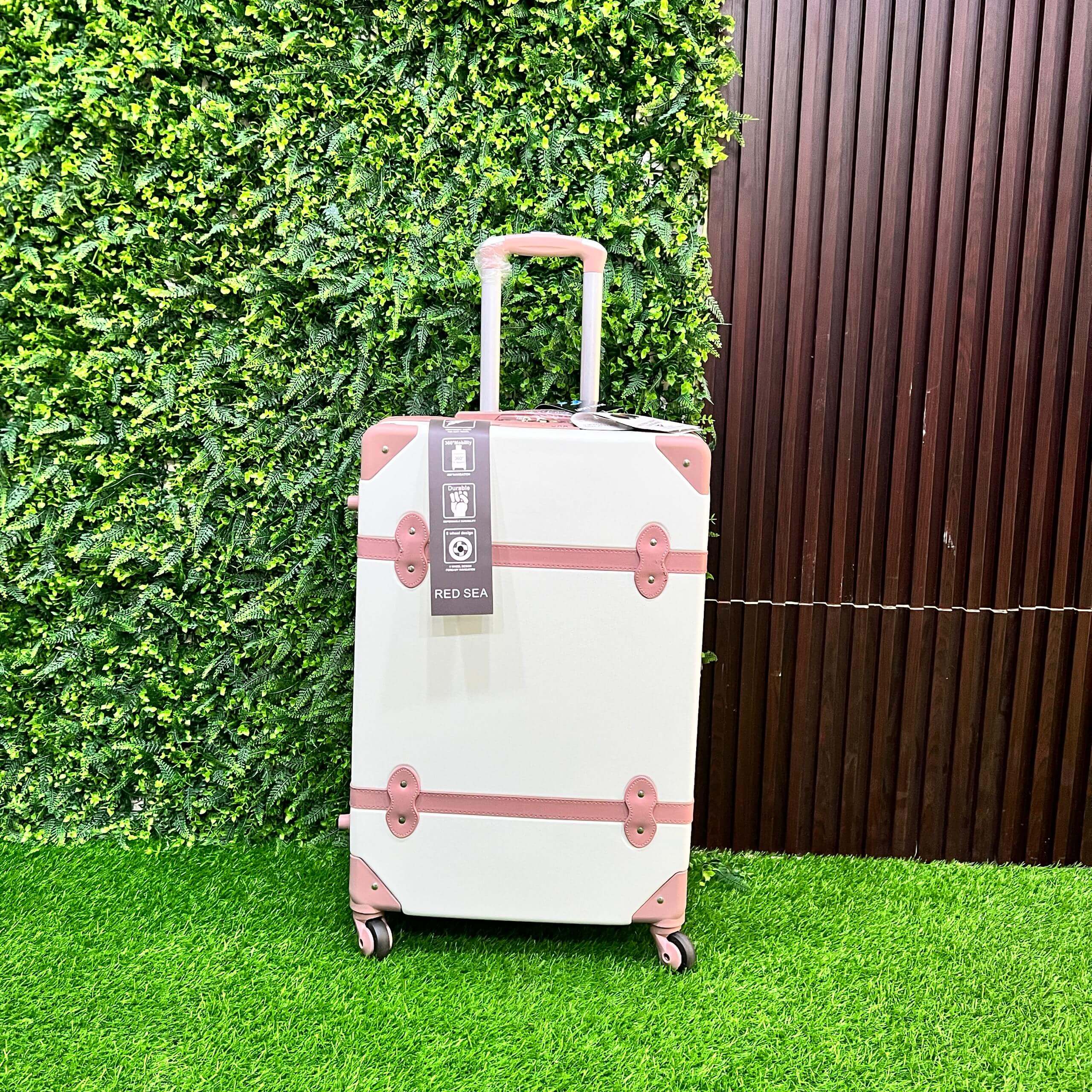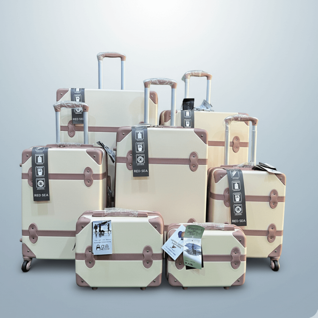 The Red Sea Voyager Elite is a sophisticated luggage set that blends vintage styling with modern travel features. Each piece showcases a cream-toned hard-shell body, tan strap accents, and reinforced corners, complemented by spinner wheels and telescopic handles for smooth mobility. With multiple size options including a vanity case, this collection is ideal for travelers seeking elegance, durability, and coordinated design.