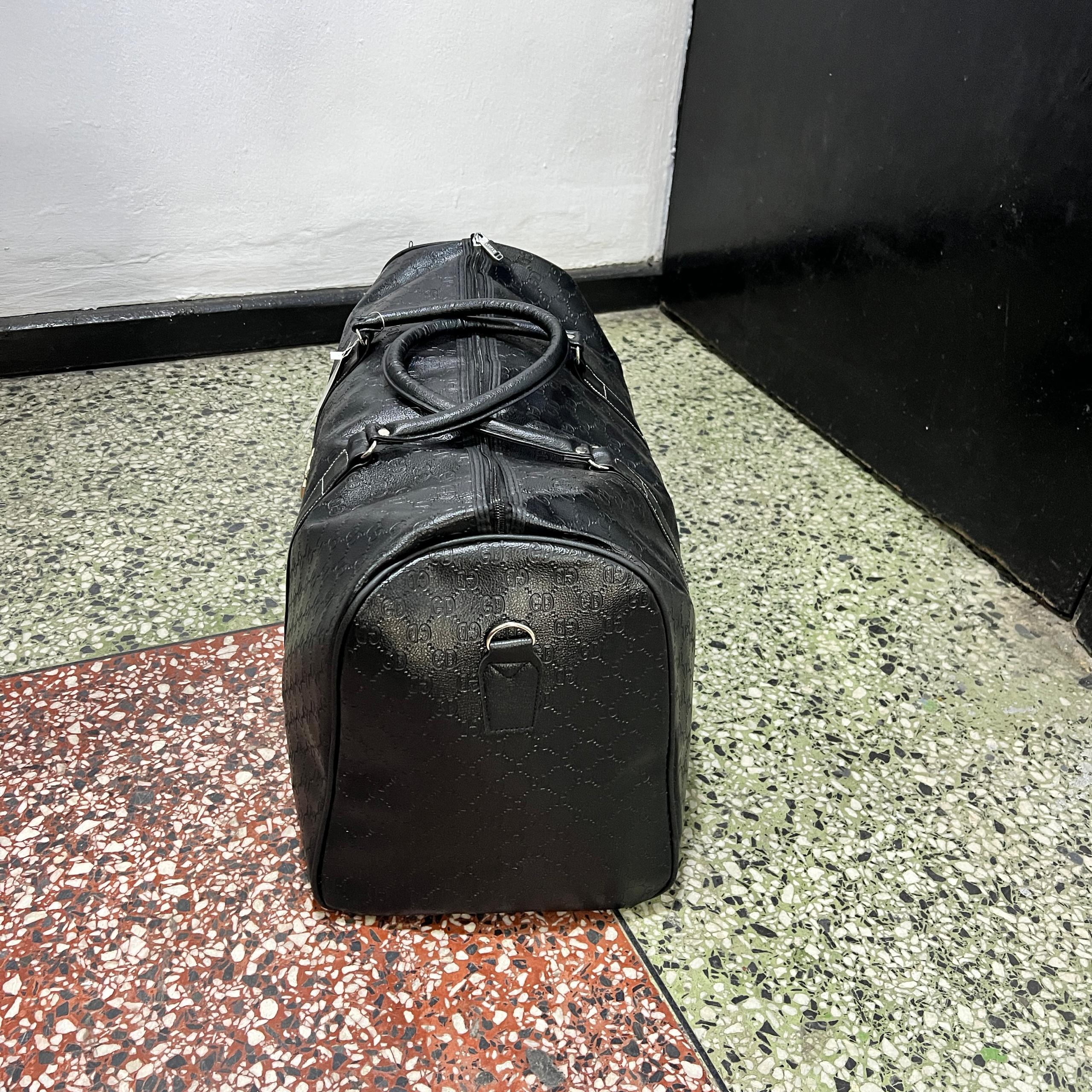 A sophisticated black leather duffel bag (20″ x 10″ x 9″) featuring Gucci’s embossed monogram, gold GG emblem, structured silhouette, and spacious interior—crafted for luxury travel and timeless style.