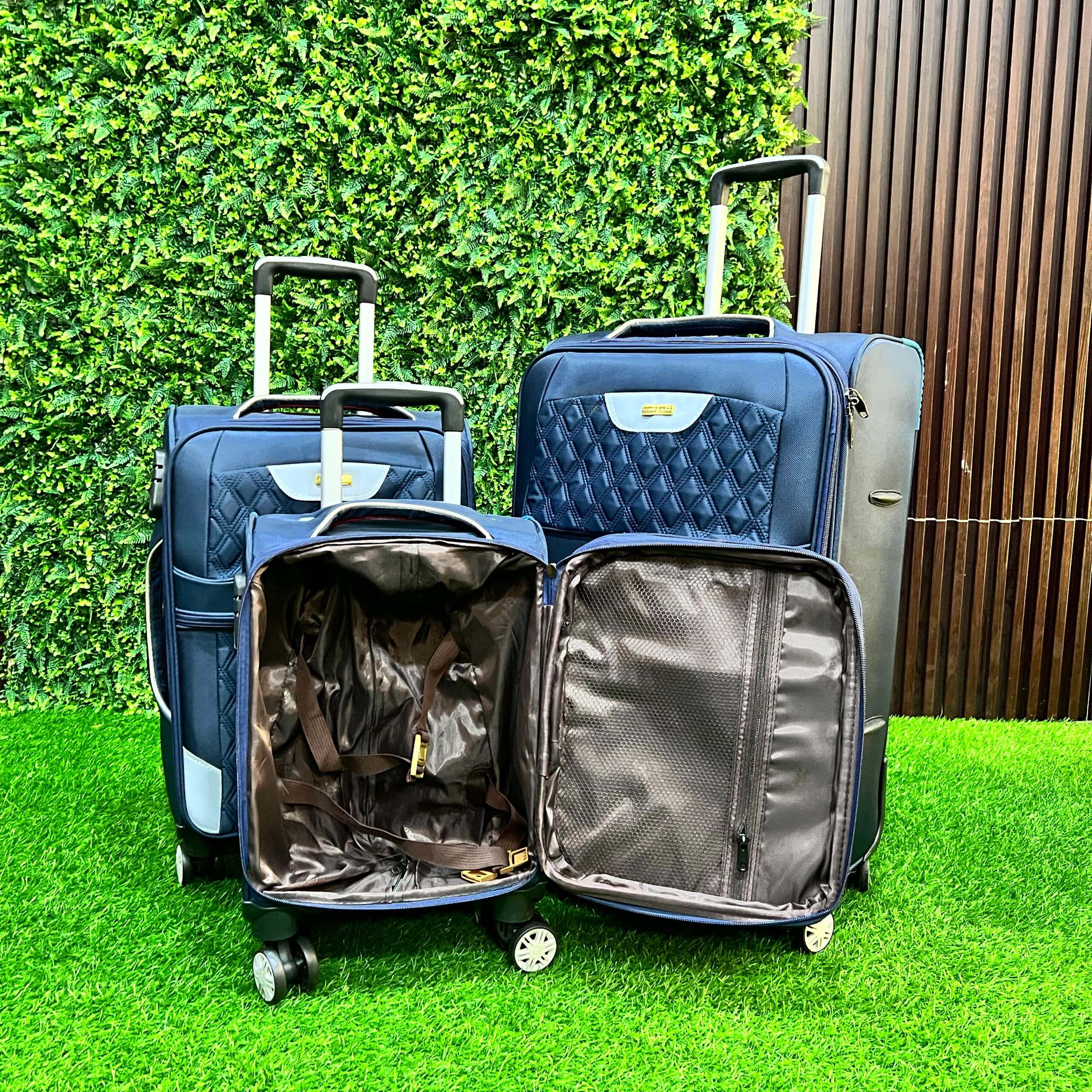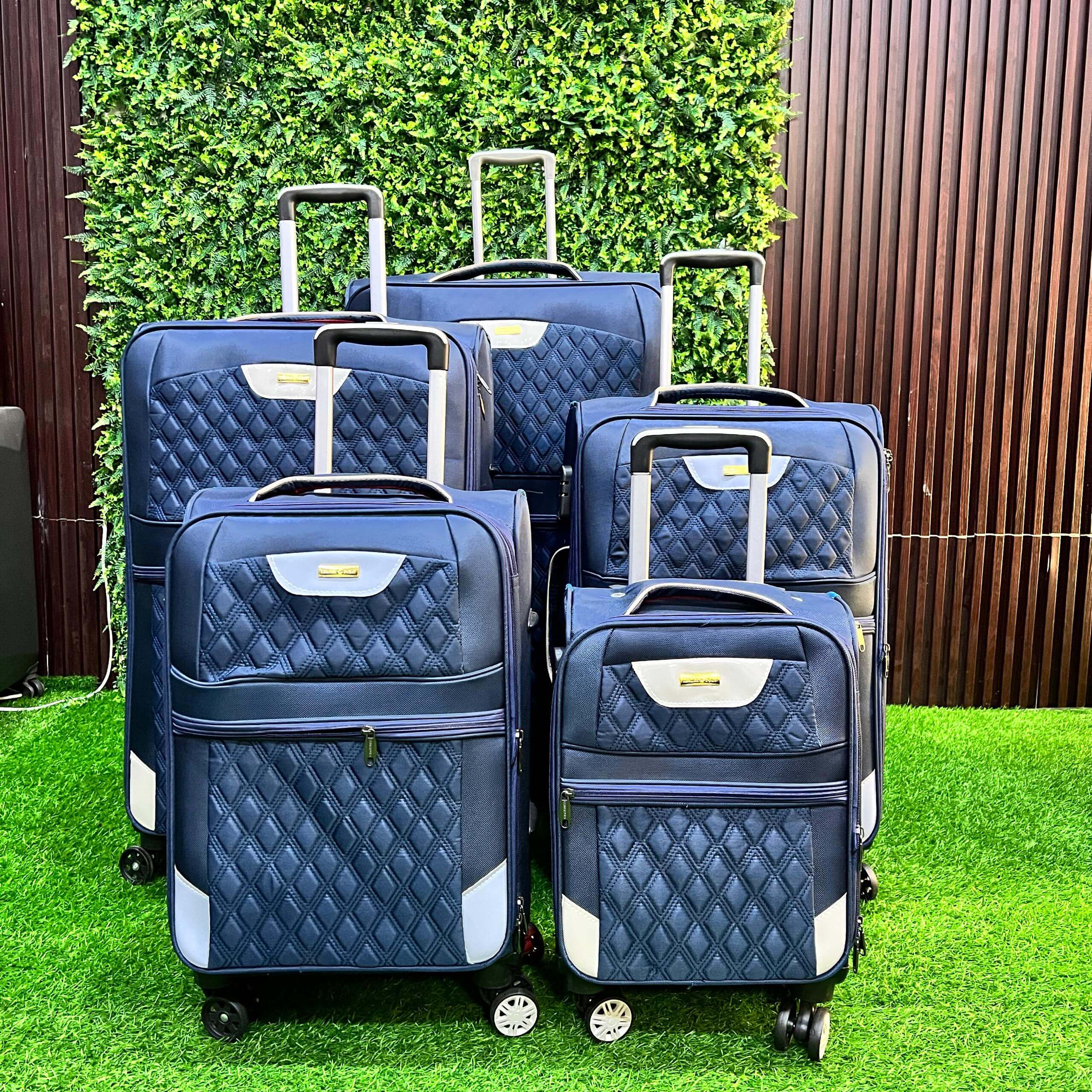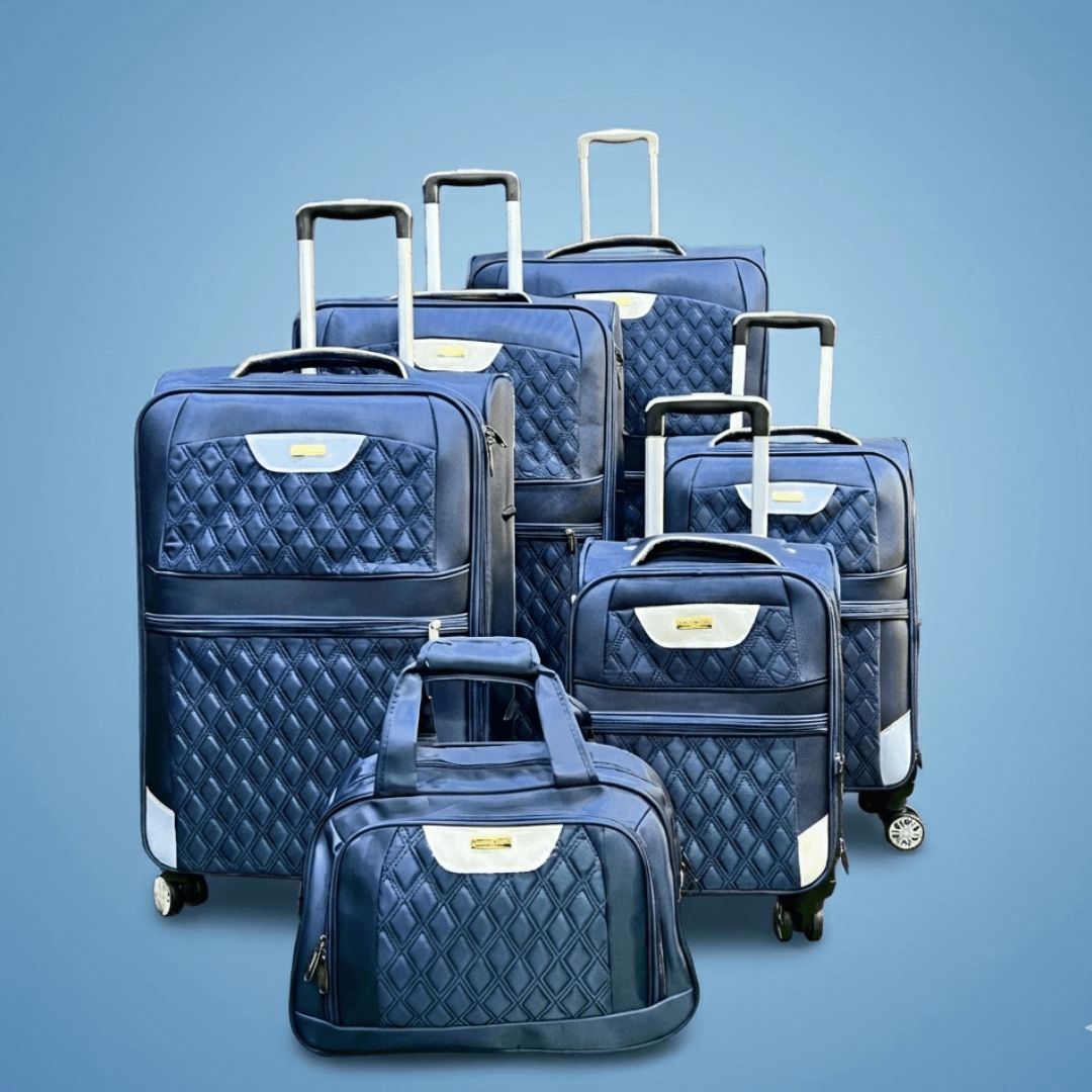 Embrace elegance in motion with the Leader Polo 5-In-1 Luggage Set — a coordinated travel ensemble designed for those who appreciate refined aesthetics and practical sophistication. Featuring a rich navy blue quilted exterior with silver-toned accents, this seven-piece set includes five upright rolling suitcases, a medium carry-on bag, and a compact duffel, offering versatility and style for every journey.