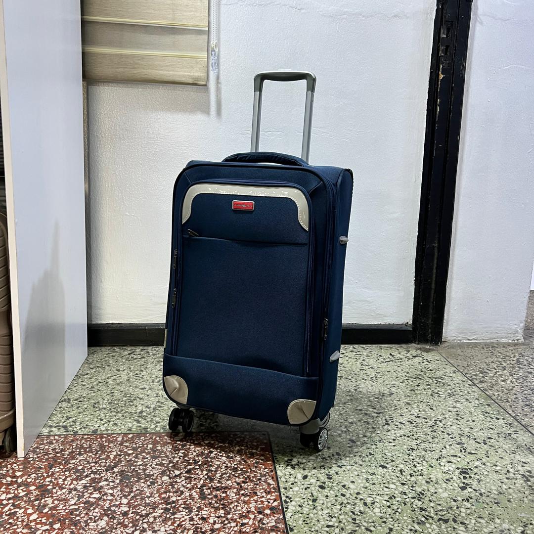 - Sleek navy blue exterior with refined silver corner accents and a bold red brand insignia for a distinguished look.