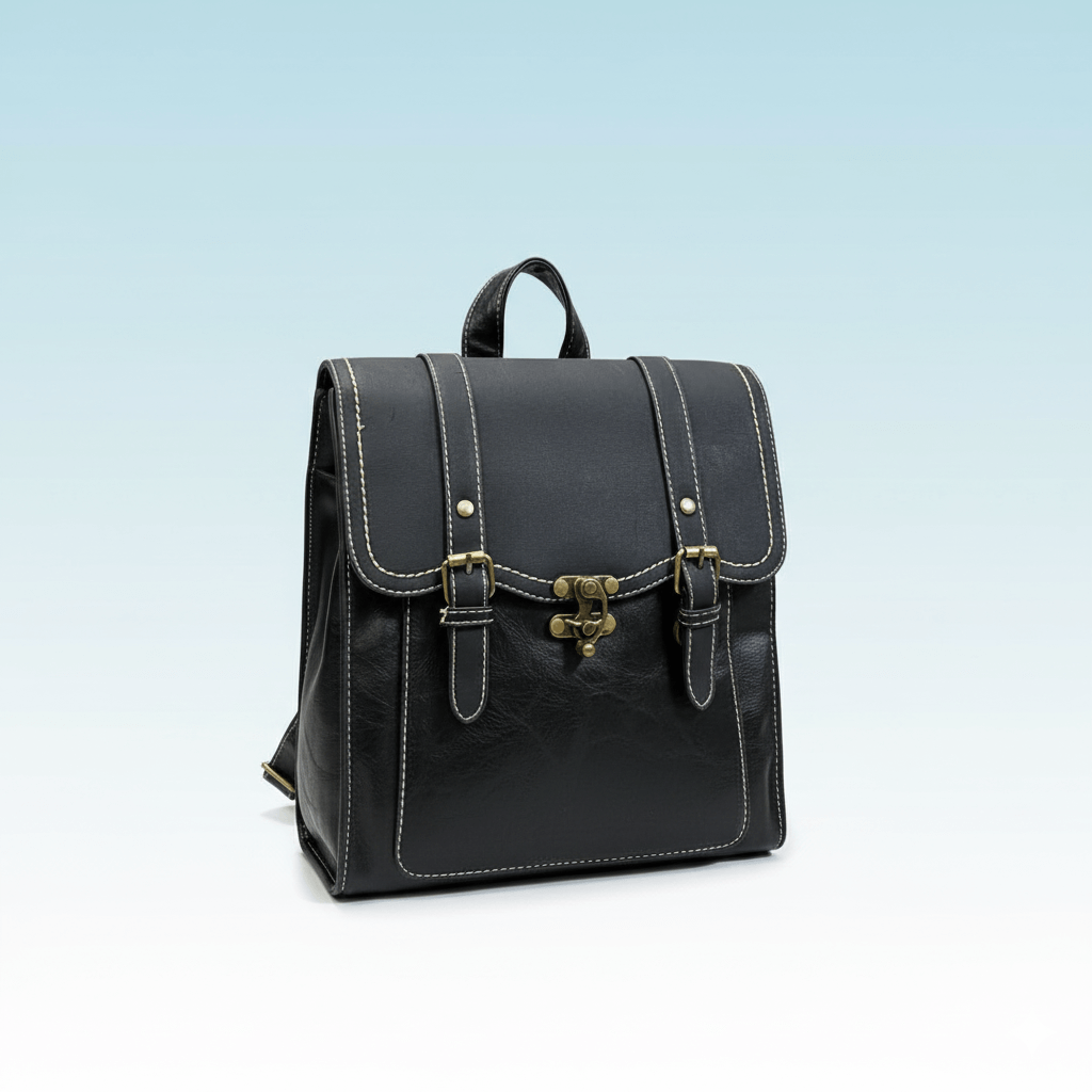 A luxurious black leather backpack with vintage charm and modern utility, featuring brass hardware, white contrast stitching, and a secure flap closure. Designed for style and function with adjustable straps, spacious interior, and a sleek 16-inch silhouette.